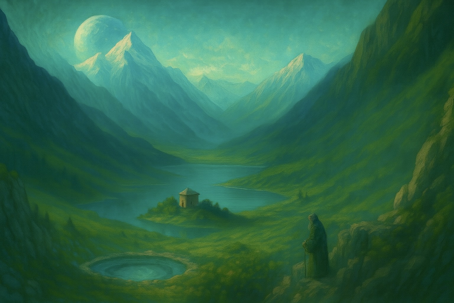 They walked single file along the narrow ledge. The Hermit moved with effortless ease. The mountainside cut away, revealing a valley shaped like a green bowl in the centre of the high white world. The valley floor shimmered with pale-green grass as though light lived inside it. Wildflowers flashed brilliant colours. A lake reflected the snow-capped peaks and the valley’s softness. In the middle of the lake lay an island, and on the island a house built from perfectly fitted stones that looked as though they had grown from the earth itself.
