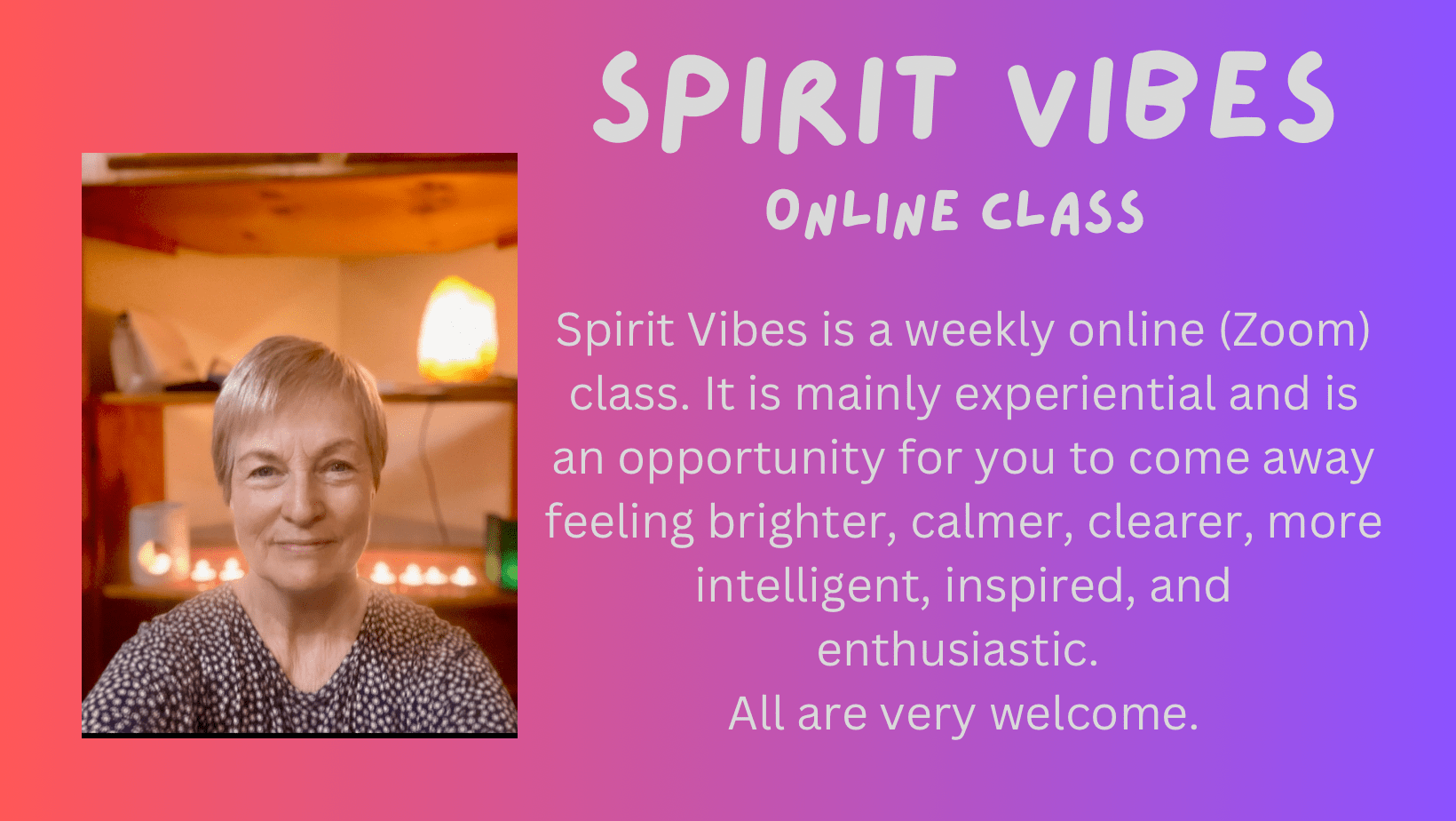 Spirit Vibes is a new weekly Zoom class. It is experiential and is an opportunity for you to come away feeling brighter, calmer, clearer, more intelligent, inspired, and enthusiastic.